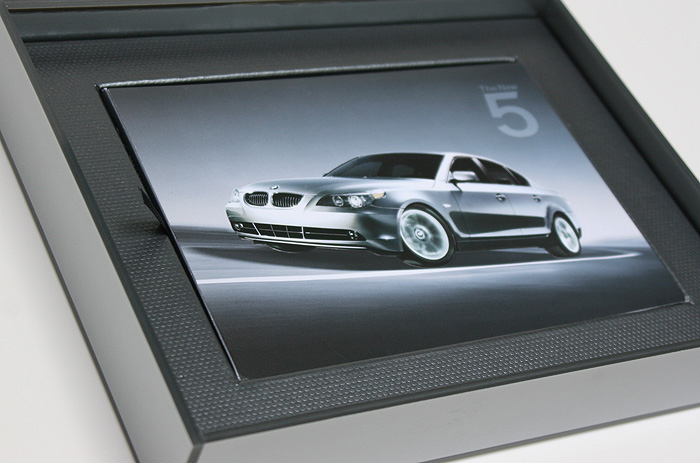 translucent sketch image of car on frosted plexiglass. Inside the kit reveals image of the new 5 Series